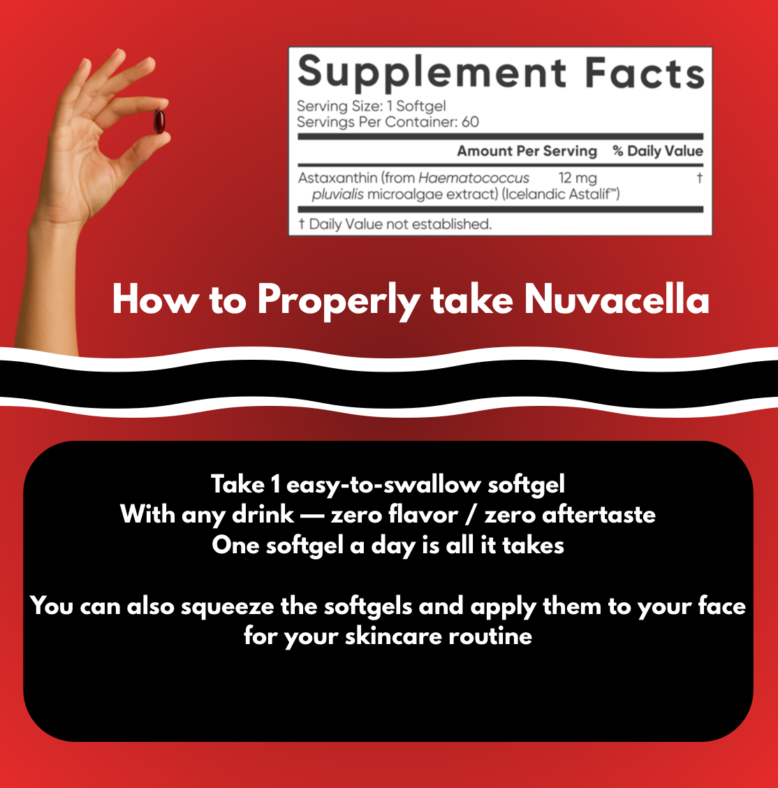 Couldn't load pickup availability Only 14 left in stock Take one soft gel per day with water, preferably with a meal for best absorption. If you also plan on using it as an everyday skin care routine You can squeeze the softgels and apply the oil directly to your face to help your skin look smoother and more radiant over time. Each softgel contains 12 mg of pure Astaxanthin from microalgae, plus sunflower oil for better absorption. Softgel ingredients: gelatin, water, glycerin. • Skin: Reduces wrinkles, puffiness & dullness for a smoother, younger look. We provide insured and tracked shipping for every order. The estimated delivery times after shipment are as follows: USA: 3-7 business days, UK: 7-18 business days, Australia: 7-18 business days, Canada: 7-18 business days, Europe: 7-18 business days, Rest of the world: 14-20 business days. We have a strong affection for our products, and we believe that you will share the same sentiment. Therefore, we are providing a 30-Day Trial, free from any risks. Clinically shown to reduce wrinkles, support collagen, brighten skin, and protect cells from premature aging — all in one daily softgel.
